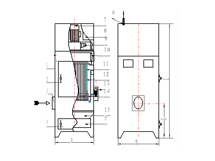 含塵氣體進入箱體,由扁布袋過濾器進行過濾,粉塵被阻留在濾袋外表面,已凈化的氣體通過濾袋進入風機,由風機吸入直接排入室內(也可接管排至室外)。隨著過濾時間的增加、濾袋外表面沾附的粉塵也不斷增加、濾袋阻力也相應增加,從而影響除塵效果,采用自控清灰機構進行定時振打清灰或手控清灰機構停機后自動振打數十秒鐘,使沾在濾袋外表面的粉塵抖落下來,落到集塵容器(抽屜)中的粉塵由人工拉出清理。